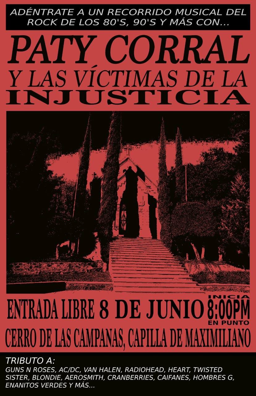 Víctimas de la Injusticia y Paty Corral nos llevarán a todos a un viaje sonoro a través del rock de los años ochenta y noventas, tanto en español como en ingles, claramente un homenaje a las canciones icónicas que resonaron en las calles y hogares de aquellos ayeres, ¡eres libre de ir con el look ochentero!