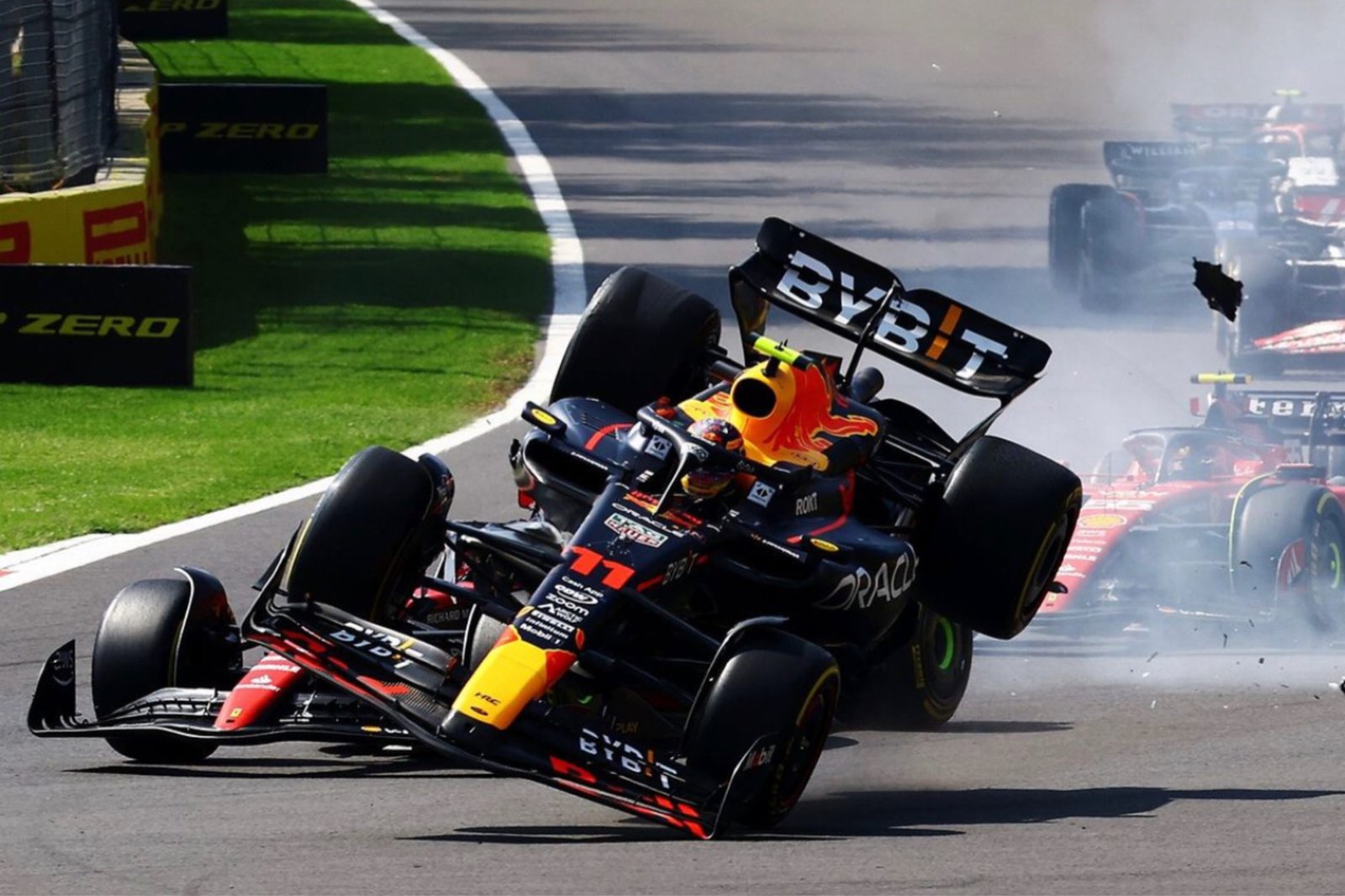 ¡Y en la primera curva! Al arrancar la carrera del Gran Premio de México, Checo Pérez, tuvo un fuerte contacto con Charles Leclerc y lo dejo fuera de la carrera.
