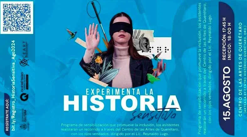 Para asistir al programa de sensibilización, los interesados deben registrarse de manera gratuita en https://bit.ly/Registro_HistoriaSensitiva_Ago2024 . Hasta ahora se han llevado a cabo 72 recorridos con la asistencia de casi mil 500 personas, en sedes como el CEART, el Museo de Arte de Querétaro, Galería Libertad, Palacio de Gobierno, el Ex Convento de la Santa Cruz y Plaza Antea.