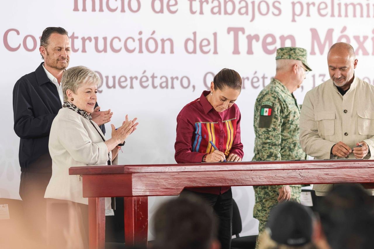 La titular del Poder Ejecutivo Federal se dijo gustosa de anunciar la puesta en marcha del “Tren México – Querétaro”, el cual considera vías adicionales al tren de carga, con vías especiales para el tren de pasajeros, y que será construido por el Agrupamiento de Ingenieros “Felipe Ángeles”, que pertenece a la Secretaría de la Defensa Nacional (SEDENA).