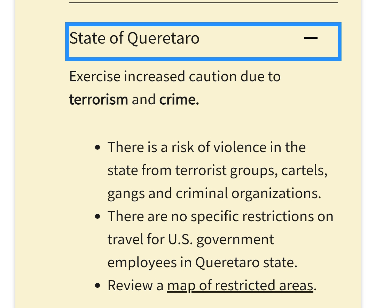 El Departamento de Estado de Estados Unidos actualizó esta semana su alerta de viaje para México, colocando al estado de Querétaro en el Nivel 2 – “Ejercer mayor precaución”, debido a riesgos relacionados con crimen y, por primera vez, con terrorismo.