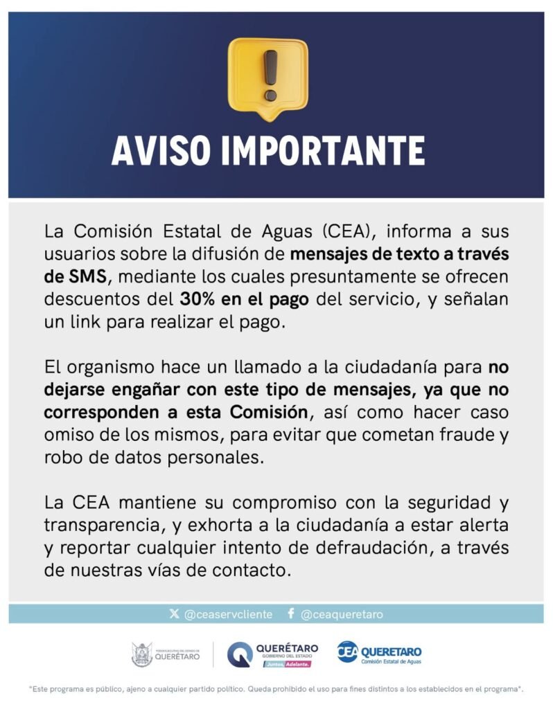 La Comisión Estatal de Aguas (CEA) de Querétaro emitió una alerta sobre mensajes de texto fraudulentos que están circulando entre usuarios del servicio, en los que se promete un supuesto descuento del 30 % en el pago del agua.