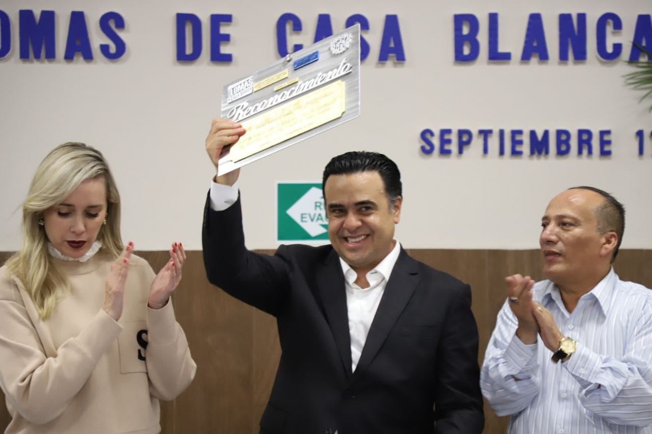 El Presidente de la Federación de Uniones de Comerciantes Querétaro en Pequeño y Secretario General de la Unión de Locatarios del Mercado Municipal de Lomas de Casa Blanca, Rafael Granados Guerrero, entregó un reconocimiento a Luis Nava y a su esposa Arahí Domínguez, por sus seis años de trabajo y apoyo incondicional al Mercado Municipal de Lomas de Casa Blanca.