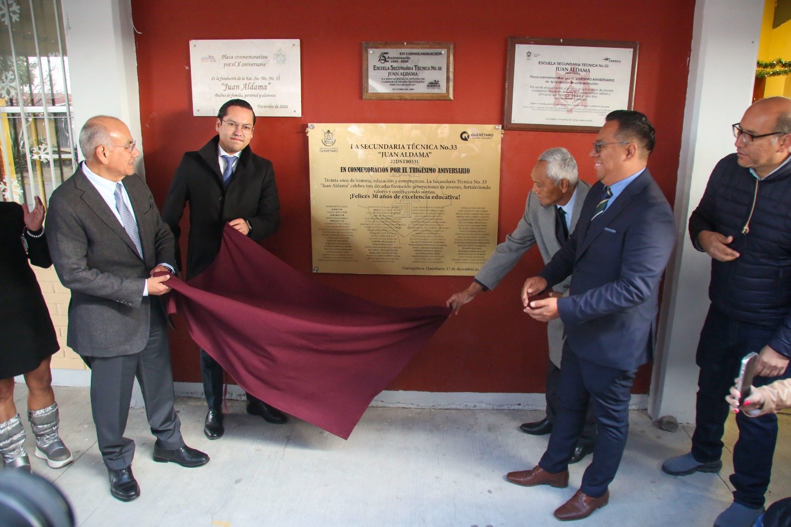 El presidente municipal de Corregidora, Chepe Guerrero, anunció la construcción de una aula-cocina para el próximo año en beneficio de las y los alumnos de la Escuela Secundaria Técnica No. 33 “Juan Aldama” en la Colonia Los Ángeles, donde develó una placa conmemorativa, por el 30 aniversario.