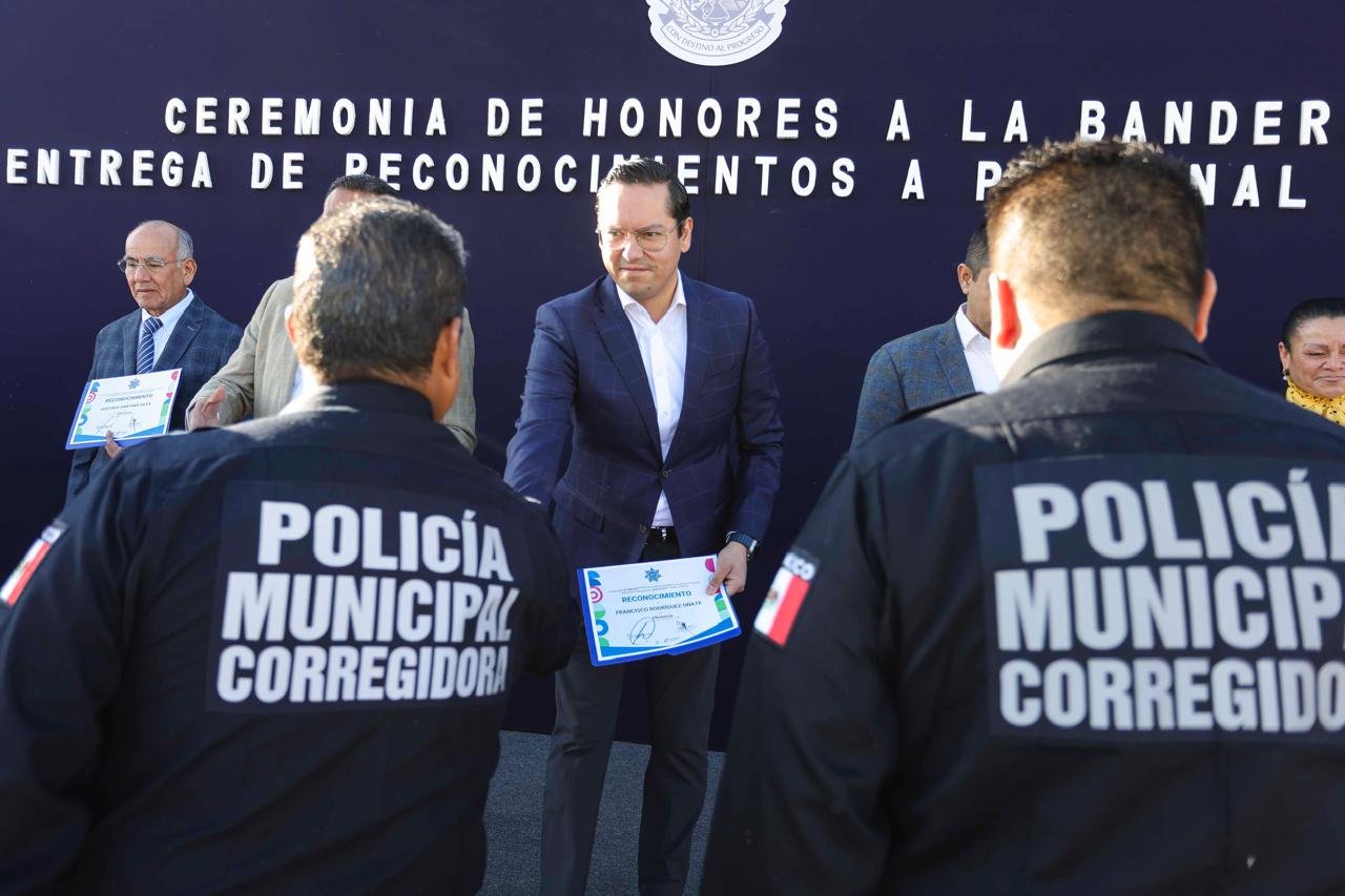 El presidente municipal de Corregidora, Chepe Guerrero, encabezó los honores a la bandera en las instalaciones de la Secretaría de Seguridad Pública Municipal. Además, entregó 52 reconocimientos a policías, tres monitoristas y una operadora de la línea de emergencia 911 por su destacada eficiencia en el ejercicio de sus funciones.