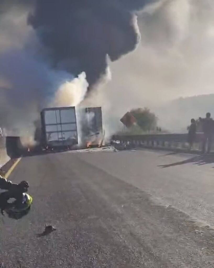 El incidente se registró a la altura del kilómetro 65, donde tras la colisión una de las unidades comenzó a arder, generando una intensa columna de humo visible a varios kilómetros y obligando al cierre de la circulación mientras se atendía la emergencia. Actualmente se registra circulación con reducción de carriles.