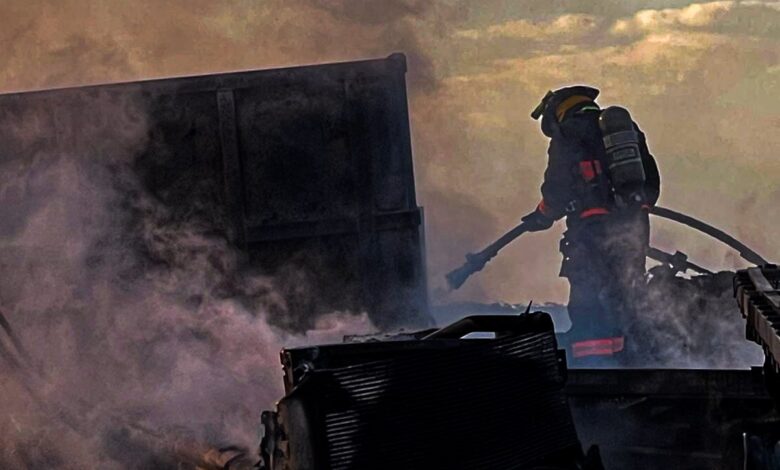 Tras el impacto, uno de los tractocamiones se incendió de manera inmediata, generando una rápida propagación del fuego en la cabina.