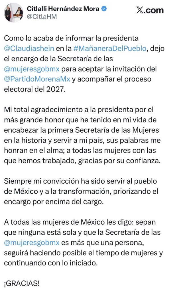 Citlalli Hernández presentó su renuncia a la Secretaría de las Mujeres del Gobierno de México, decisión que fue confirmada este miércoles como parte de una reconfiguración política rumbo al proceso electoral de 2027.