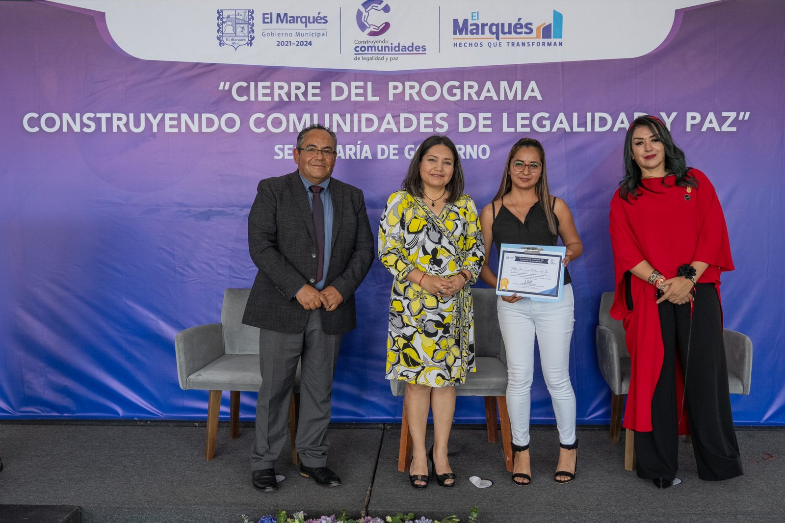 La presidenta municipal de El Marqués, Claudia Martínez Guevara, encabezó el cierre del programa “Construyendo Comunidades de Legalidad y Paz”, mismo que tiene como objetivo fomentar una cultura de responsabilidad, respeto y conciencia, a través de la difusión de la tolerancia, los Derechos Humanos, la no discriminación y la no violencia.