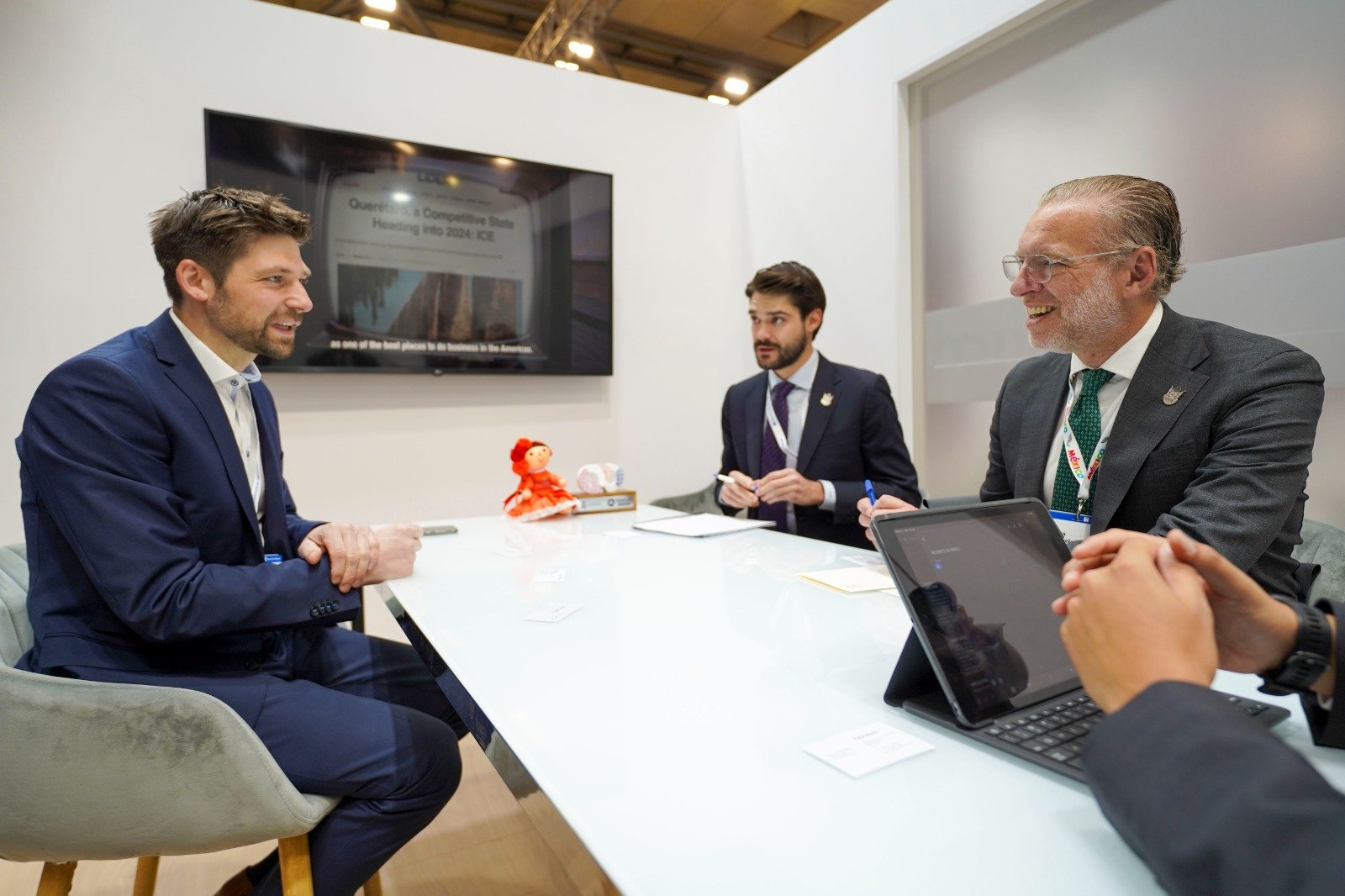 La comitiva queretana encabezada por el titular de la SEDESU y el director de Fomento Industrial, Alejandro Rolland Ruiz, se reunió con el gerente de Desarrollo de la firma alemana del sector automotriz, Robert Krichenbauer, en la que compartieron los detalles del proyecto de expansión para aumentar las capacidades de producción de la empresa instalada en el Parque Industrial Querétaro, desde donde se fabrican componentes decorativos para interiores de vehículos.