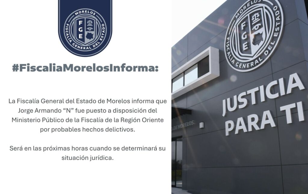 La Fiscalía General del Estado de Morelos confirmó la detención de Jorge Armando “N”, presidente municipal de Tlalnepantla, por su presunta responsabilidad en un delito de carácter sexual en agravio de una adolescent.