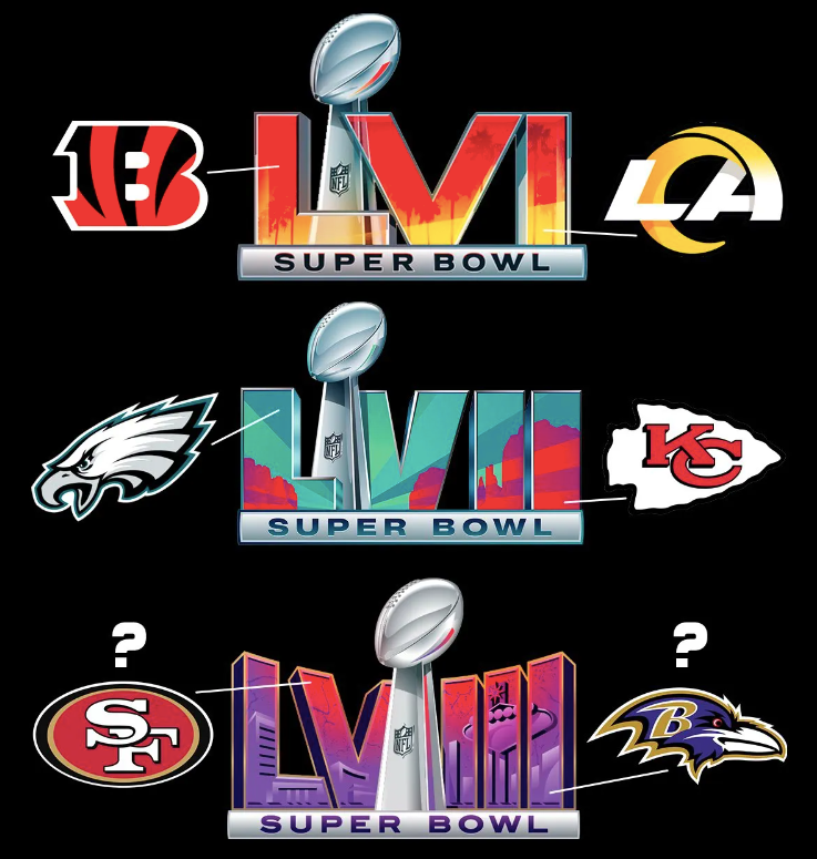 Para entenderla mejor hay que regresar a los últimos dos super tazones. En la edición LVI los colores del logo fueron naranja y amarillo y los finalistas fueron Bengals y Rams. En la edición LVII el logo fue rojo y verde y los finalistas fueron Eagles y Chiefs ¿coincidencia?
