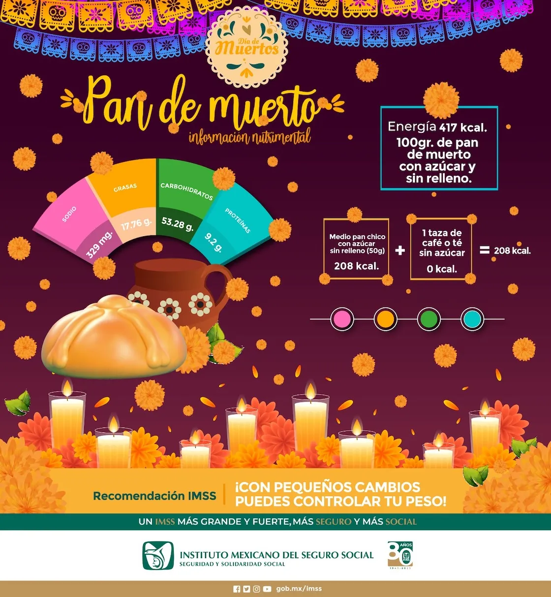 Y para los curiosos, el IMSS desmenuza la info: un pan de muerto chico azucarado lleva 329 mg de sodio, 17.76 g de grasa, 53.28 g de carbohidratos y 9.2 g de proteínas. 📊