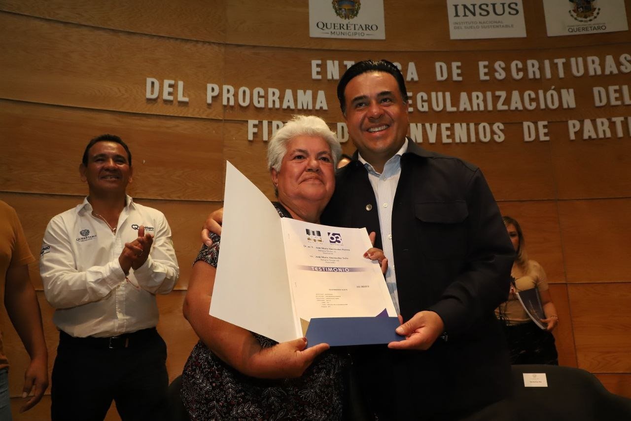 El Presidente Municipal de Querétaro, Luis Nava, encabezó la entrega de escrituras públicas del programa “Regularización del Patrimonio Familiar”, que al día de hoy ha beneficiado a más de mil queretanas y queretanos de 26 comunidades que hoy cuentan con la certeza jurídica sobre su patrimonio.