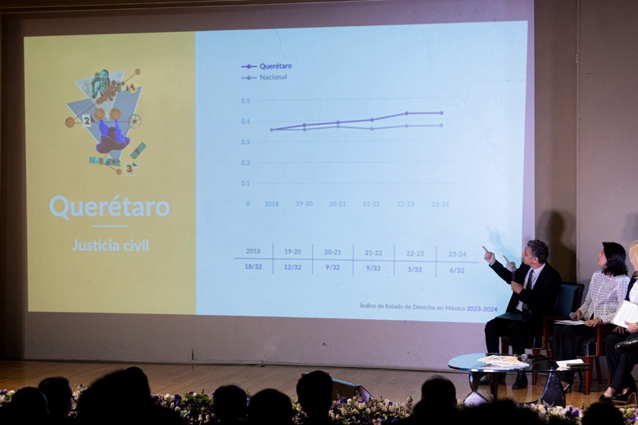 Como parte de esta presentación, el jefe Global de Incidencia de World Justice Project, Alejandro González, encabezó el conversatorio Retos y Propuestas para el Futuro, donde destacó que además de los resultados constantes en justicia penal, en los últimos años se ha observado una tendencia a la alza en mejoras al sistema de justicia civil de Querétaro.