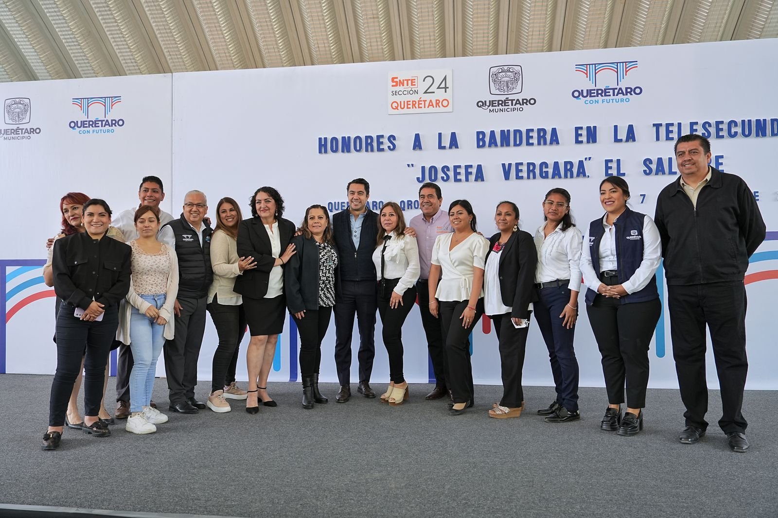 El Presidente Municipal de Querétaro, Felifer Macías, encabezó la ceremonia de Honores a la Bandera en la Telesecundaria “Josefa Vergara”, ubicada en la comunidad de El Salitre, dentro de la delegación Epigmenio González. Durante su intervención, el alcalde destacó la importancia de la educación como el principal motor para construir un futuro prometedor para Querétaro.