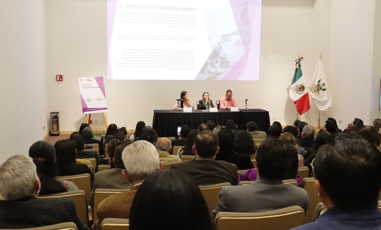 En su exposición, Humphrey Jordan explicó los antecedentes y el contenido de la reforma a 21 artículos de la Constitución Federal, aprobada en septiembre de 2024, así como las normas secundarias, las determinaciones del INE y otros aspectos relacionados con el proceso electoral extraordinario.