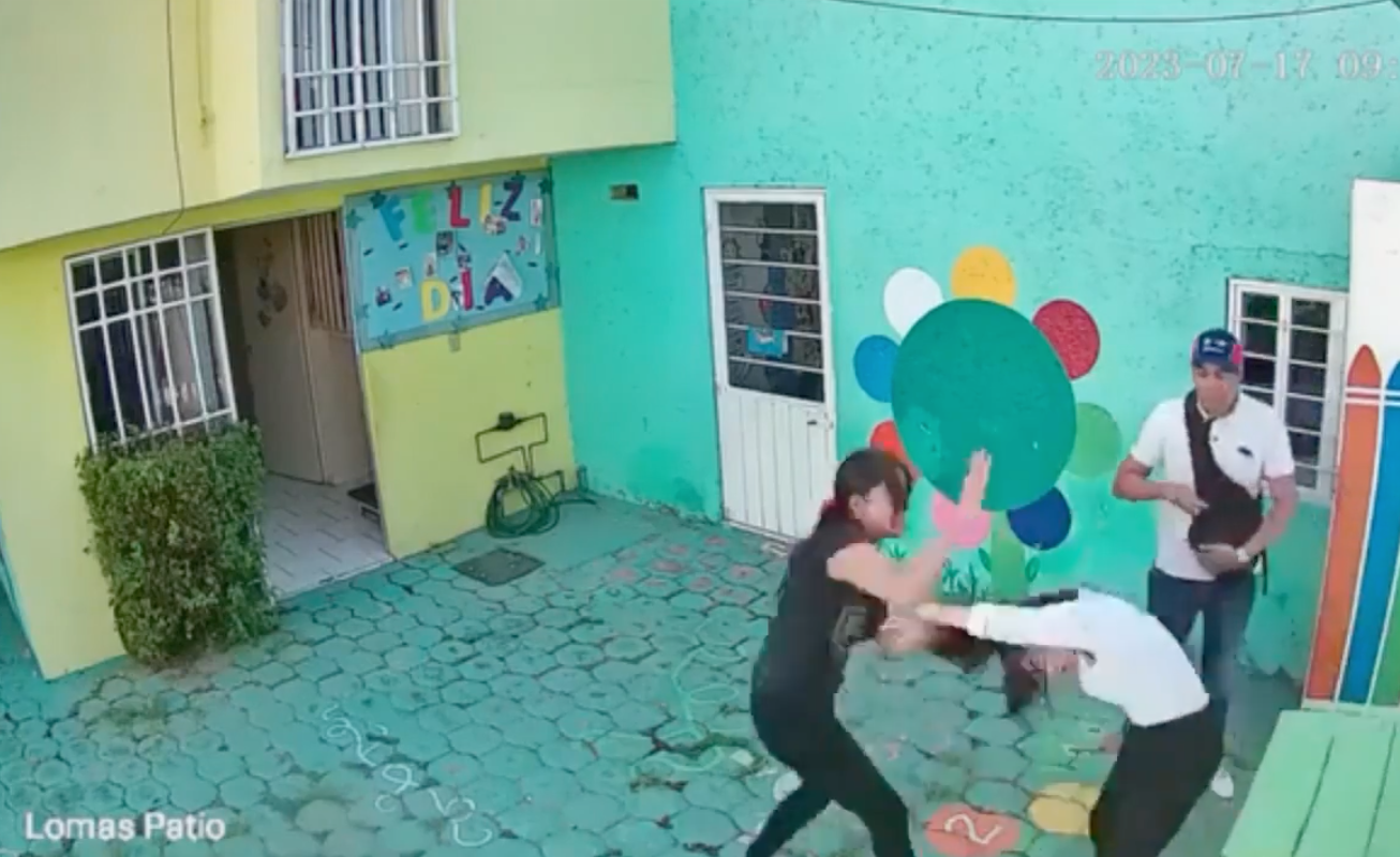 Vamos a situarnos en el cronómetro de la discordia, justo a las 09:41 AM del lunes, en el kínder Frida Kahlo, ubicado en la Avenida San Francisco de Asís. Bueno, todo fue captado por la cámara de seguridad del lugar, la maestra, despreocupada, salió de su salón y fue a abrir la puerta, como de costumbre. Pero, ¡sorpresa! Los papás del niño se aproximaron y ¡pum! La mamá se volvió Bruce Lee y le soltó unos golpes y jalones de cabello a la pobre maestra.