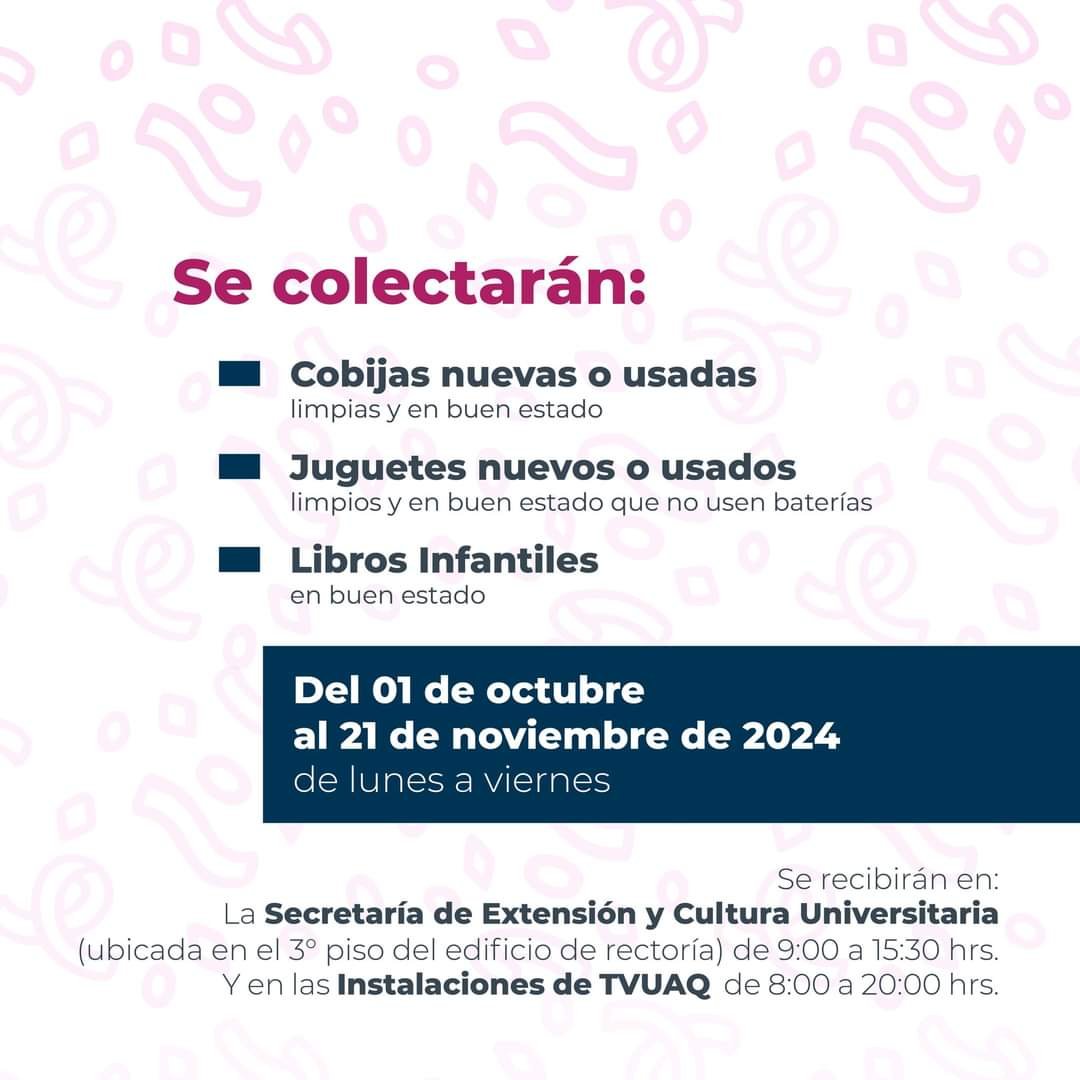 El titular de la dependencia universitaria, Dr. Eduardo Núñez Rojas, informó que es el tercer año que se lleva a cabo esta actividad, misma que convoca a universitarios de la Autónoma de Querétaro y a la sociedad en general a apoyar con donaciones de dichos artículos, para que sean repartidos a las infancias y adolescencias en el marco del cuarto Festival UAQ de la Sierra Gorda, a realizarse el 06, 07 y 08 de diciembre de 2024.