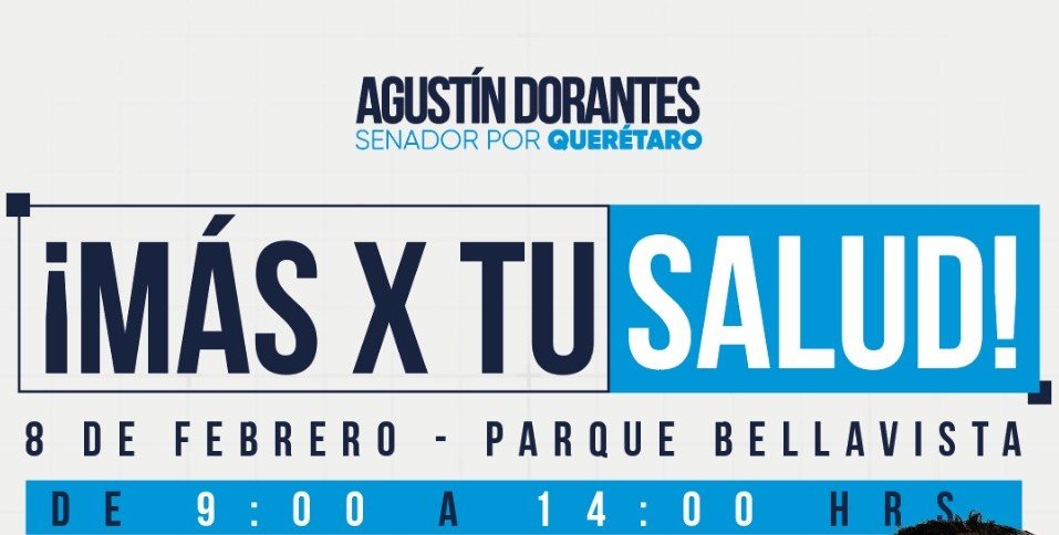 El Senador por Querétaro, Agustín Dorantes Lámbarri, anunció que este sábado 8 de febrero, desde las 9 de la mañana y hasta las 2 de la tarde, en el parque Bellavista de la Delegación Carrillo Puerto en la zona poniente de la ciudad, se realizará la primer Jornada Más Cerca que Nunca por tu Salud, donde de manera gratuita birndarán atención diversos médicos especialistas y se ofrecerán además servicios de laboratorio clínico, higiene bucal y asesoría jurídica.