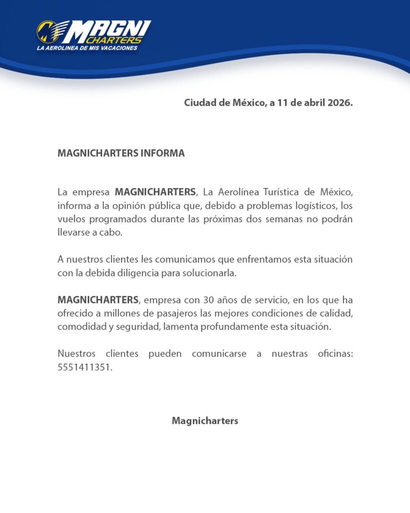 La aerolínea Magnicharters suspendió de manera repentina todos sus vuelos programados durante las próximas semanas debido a problemas logísticos, lo que dejó a pasajeros varados en distintos aeropuertos del país y provocó la intervención de autoridades federales.