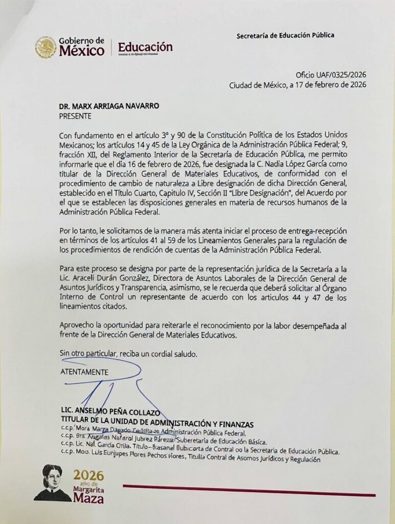 La separación del cargo fue comunicada inicialmente de manera administrativa el viernes 13 de febrero. Sin embargo, el documento formal de destitución le fue entregado días después dentro de las propias instalaciones de la SEP.
