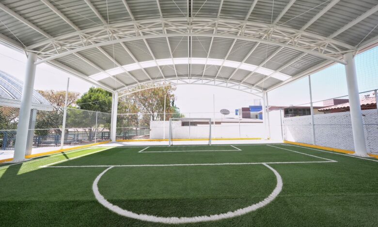 El proyecto de rehabilitación incluye la construcción de un arcotecho cimentado de 566 metros cuadrados elaborado con lámina pintro, así como una cancha de fútbol 5 de 493 metros cuadrados con pasto sintético.