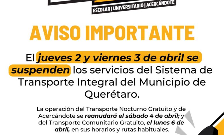 El Municipio de Querétaro informó que suspenderá los servicios del Sistema de Transporte Integral los días 2 y 3 de abril de 2026, con motivo de las celebraciones de Semana Santa, en la ciudad de Querétaro. La medida será aplicada por la Secretaría de Movilidad y contempla la reanudación gradual de operaciones a partir del 4 de abril, conforme a las características de cada sistema.