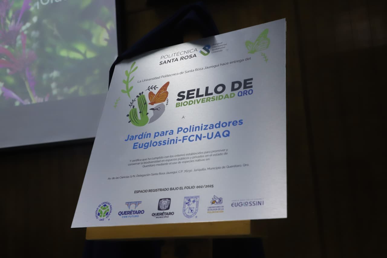 El Jardín Euglossini, ubicado en el campus Juriquilla de la Universidad Autónoma de Querétaro (UAQ), ha sido reconocido con el “Sello de Biodiversidad”, una certificación otorgada por la Universidad Politécnica de Santa Rosa Jáuregui (UPSRJ) y la Secretaría del Medio Ambiente del Municipio de Querétaro. Este distintivo destaca su contribución a la protección de los polinizadores, vitales para el equilibrio ecológico y la biodiversidad urbana.