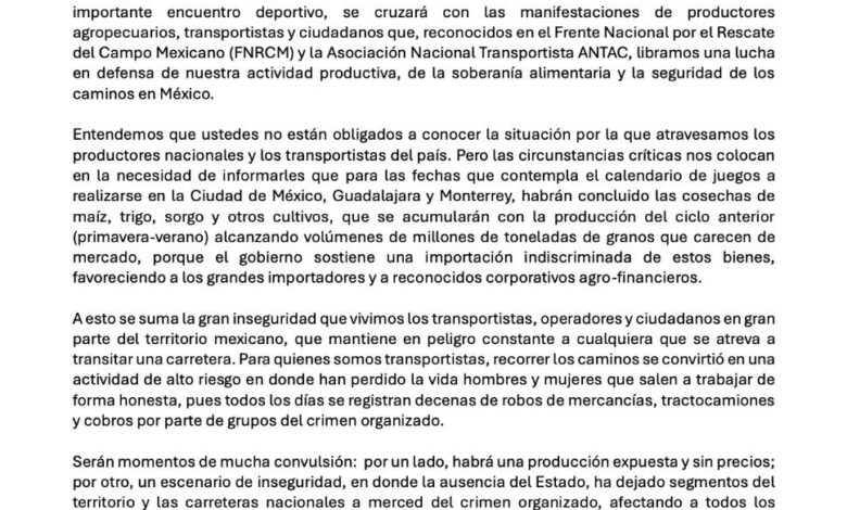 Organizaciones del sector agropecuario y del autotransporte enviaron una carta a Gianni Infantino, presidente de la FIFA, y a Mikel Arriola Peñaloza, titular de la Federación Mexicana de Fútbol, para advertir que sus movilizaciones podrían coincidir con la celebración de la Copa Mundial de Fútbol 2026 en territorio mexicano.