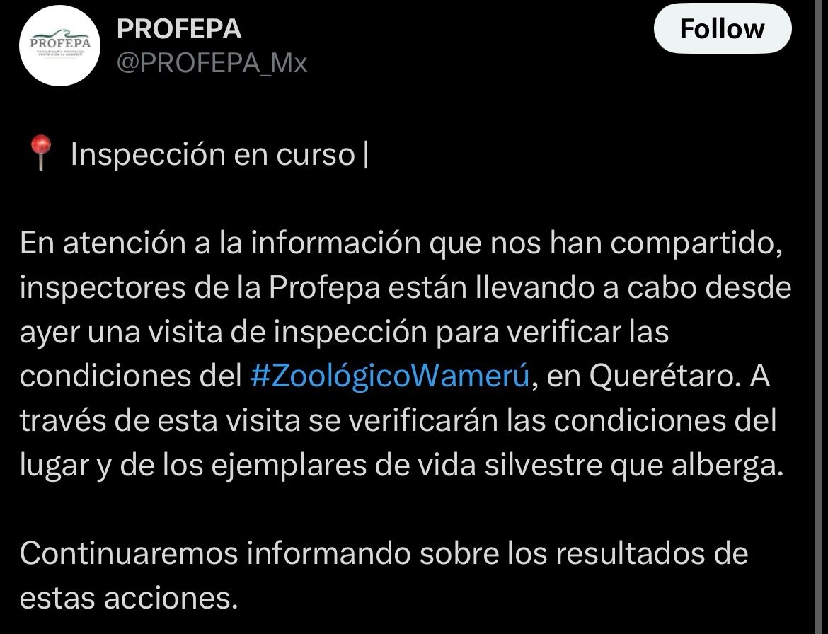 La Procuraduría Federal de Protección al Ambiente (Profepa) dió inicio a una investigación en el Zoológico Wamerú, ubicado en El Marqués, Querétaro, luego de reportes ciudadanos en redes sociales que señalan un presunto estado de abandono en el que se encontraban los animales del lugar.