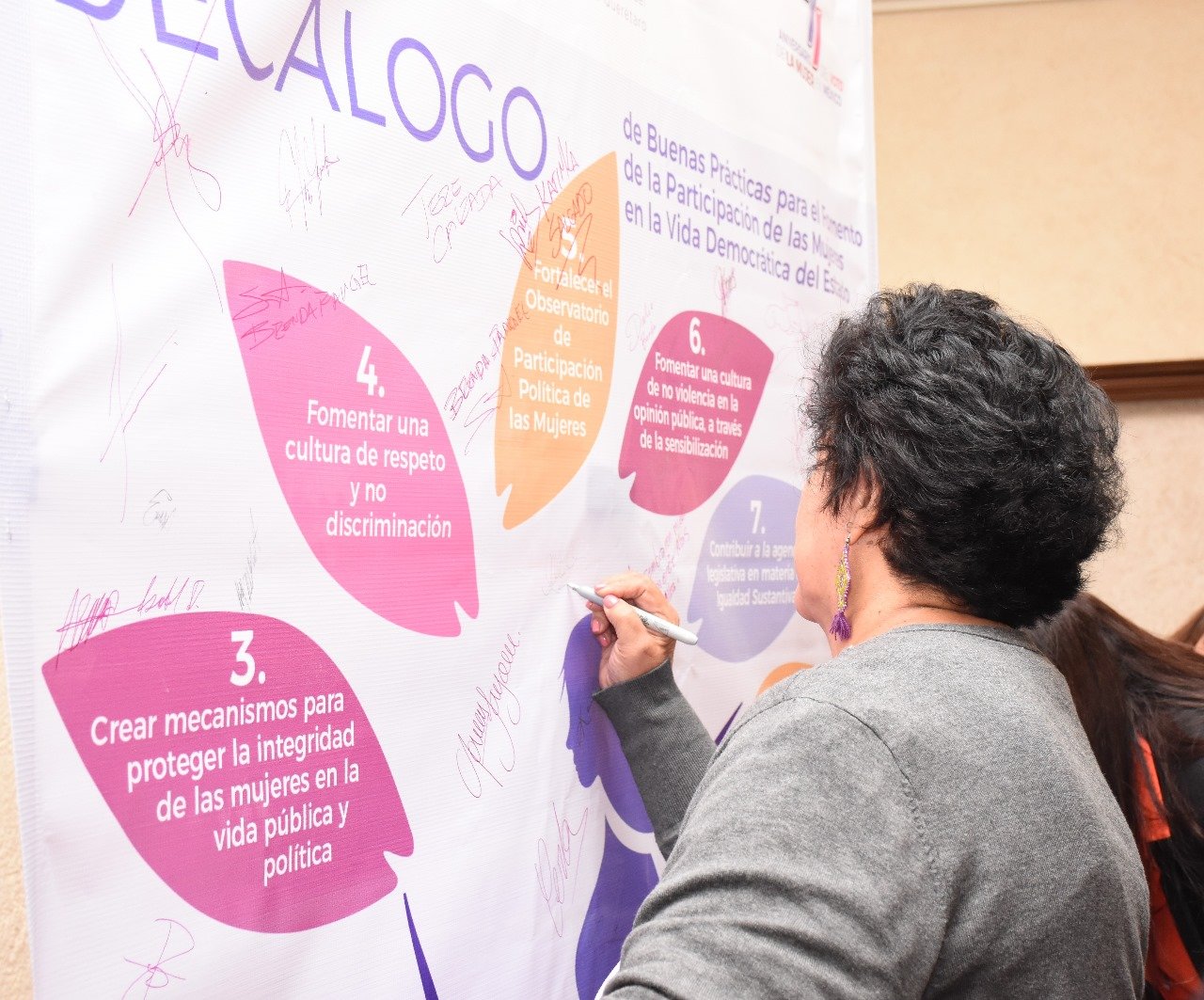 Durante el evento, que reunió a funcionarias electorales, servidoras públicas, integrantes de la academia y representantes de organizaciones de la sociedad civil, se firmó el Decálogo de Buenas Prácticas para el Fomento de la Participación de las Mujeres en la Vida Democrática del Estado.