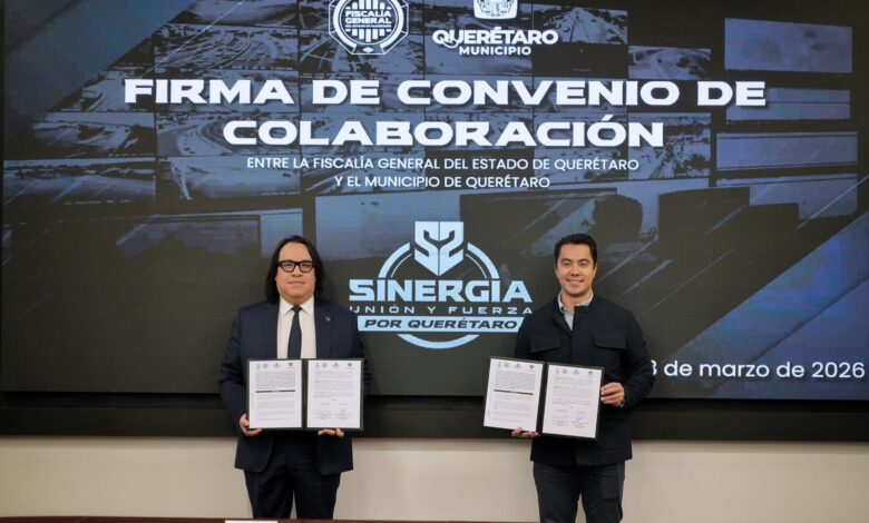 El presidente municipal de Querétaro, Felifer Macías, y el fiscal general del estado, Víctor Antonio de Jesús Hernández, firmaron un convenio de colaboración en la ciudad para fortalecer la coordinación institucional en materia de seguridad, mediante el intercambio de información y la mejora en la capacidad de respuesta ante situaciones de riesgo, con el objetivo de apoyar la investigación criminal y contribuir a la protección de las familias queretanas.
