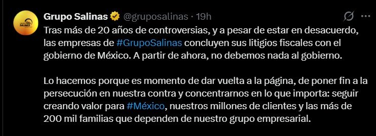 Después de 20 años de controversias fiscales, las empresas que integran Grupo Salinas acordaron concluir de manera definitiva sus litigios fiscales con el gobierno de México, a pesar de manifestar su desacuerdo con las resoluciones emitidas por la autoridad tributaria.