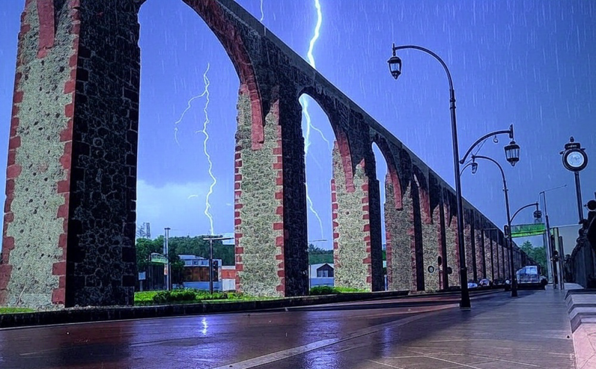 Ya sólo faltaba… rayo impacta en los Arcos de Querétaro durante las lluvias de este lunes. Debido a la tormenta eléctrica se pudo observar que un rayo golpeó una de las estructuras del Acueducto de Querétaro, generando sorpresa entre peatones y automovilistas.