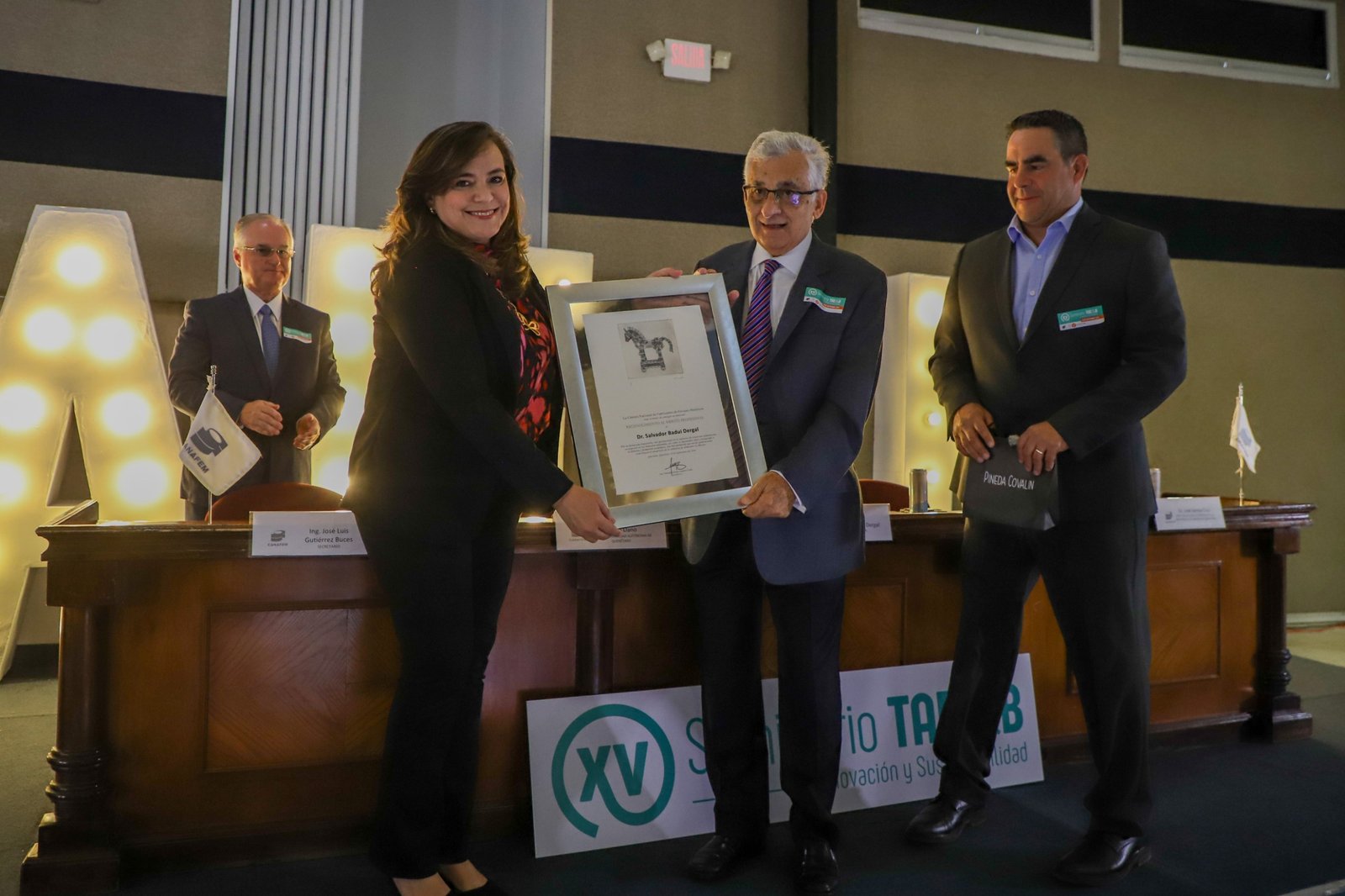 Como parte del acto de bienvenida, la rectora de la UAQ, Dra. Silvia Amaya Llano, y el presidente de la Canafem, Ing. Eduardo Argueta Corral, entregaron el primer reconocimiento al mérito profesional al Dr. Salvador Badui Dergal, por sus aportaciones a la industria de conservas alimenticias y su labor en la difusión y formación académica; quien agradeció la distinción y dio una breve charla sobre la evolución en las tecnologías de preservación.