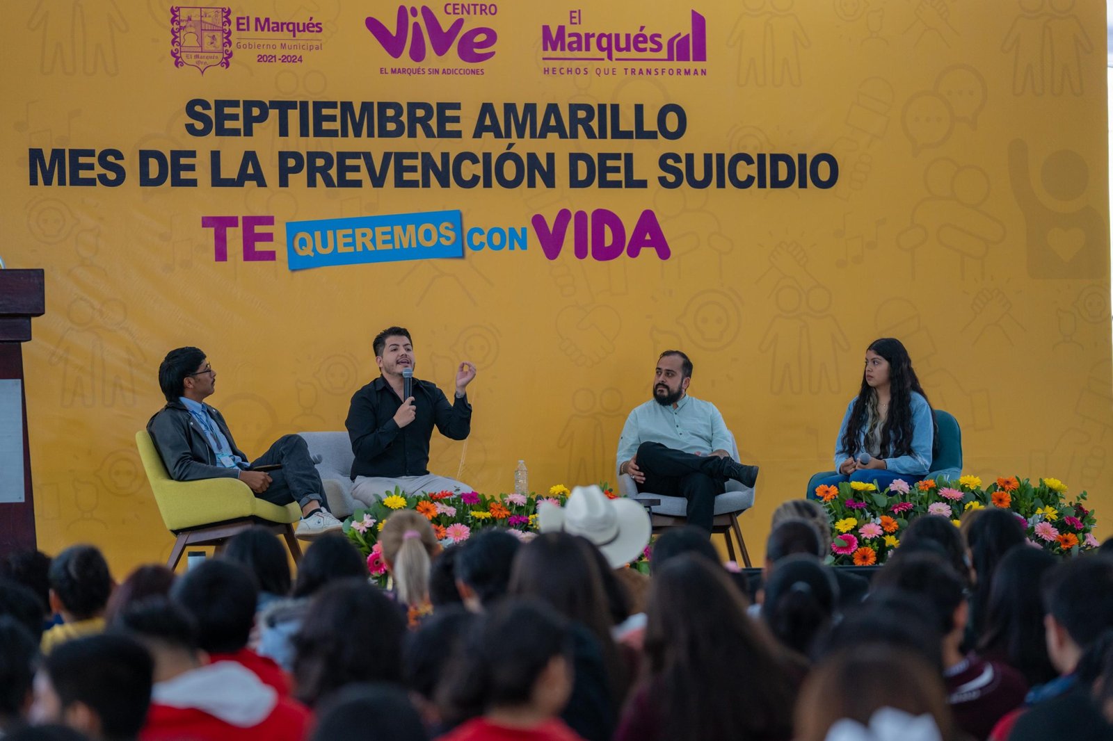 En el marco del Día Mundial para la Prevención del Suicidio, que se conmemora cada 10 de septiembre, la presidenta municipal de El Marqués, Claudia Martínez Guevara, encabezó el evento “Vive la Vida”, en el que se realizó el conversatorio “Te queremos con vida” ante 1,500 alumnos y habitantes de El Marqués.