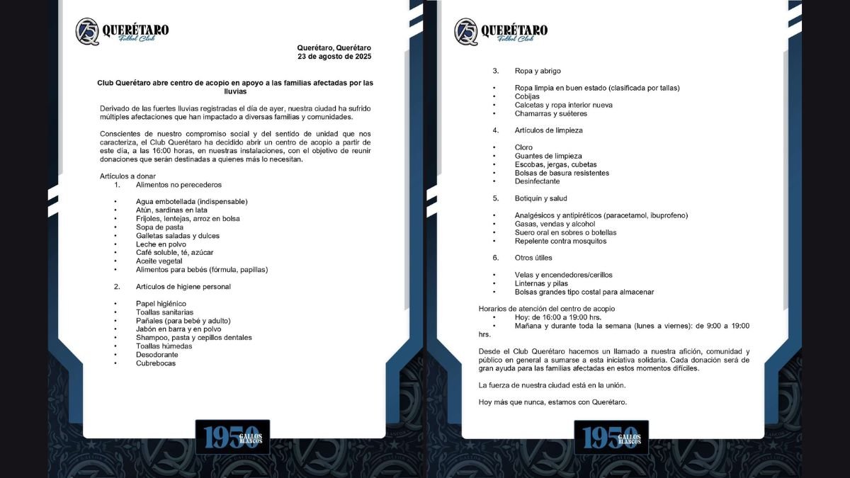 Tras las fuertes lluvias ocurridas en Querétaro, este viernes pasado, no solo dejaron afectaciones en calles y viviendas. También despertó en nosotros el impulso de cuidar, de responder y de ayudar. El Club Querétaro, fiel a su historia y a su gente, abrió este 23 de agosto un centro de acopio en sus instalaciones.