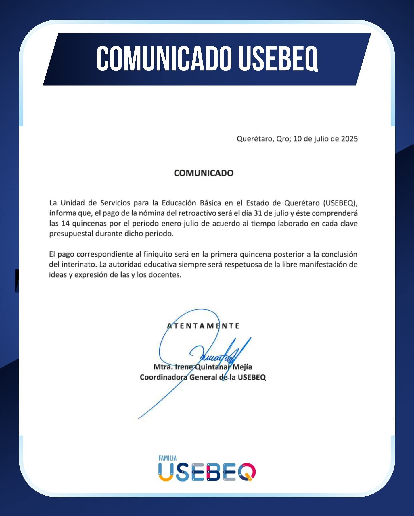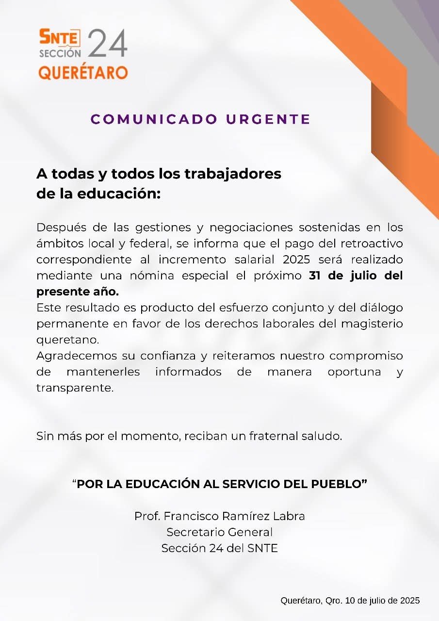 Trabajadores de la educación en Querétaro recibirán el pago del retroactivo correspondiente al incremento salarial 2025 el próximo 31 de julio, de acuerdo con un anuncio realizado por la Sección 24 del Sindicato Nacional de Trabajadores de la Educación (SNTE) y con un breve comunicado de la Unidad de Servicios para la Educación Básica en el Estado de Querétaro (USEBEQ).