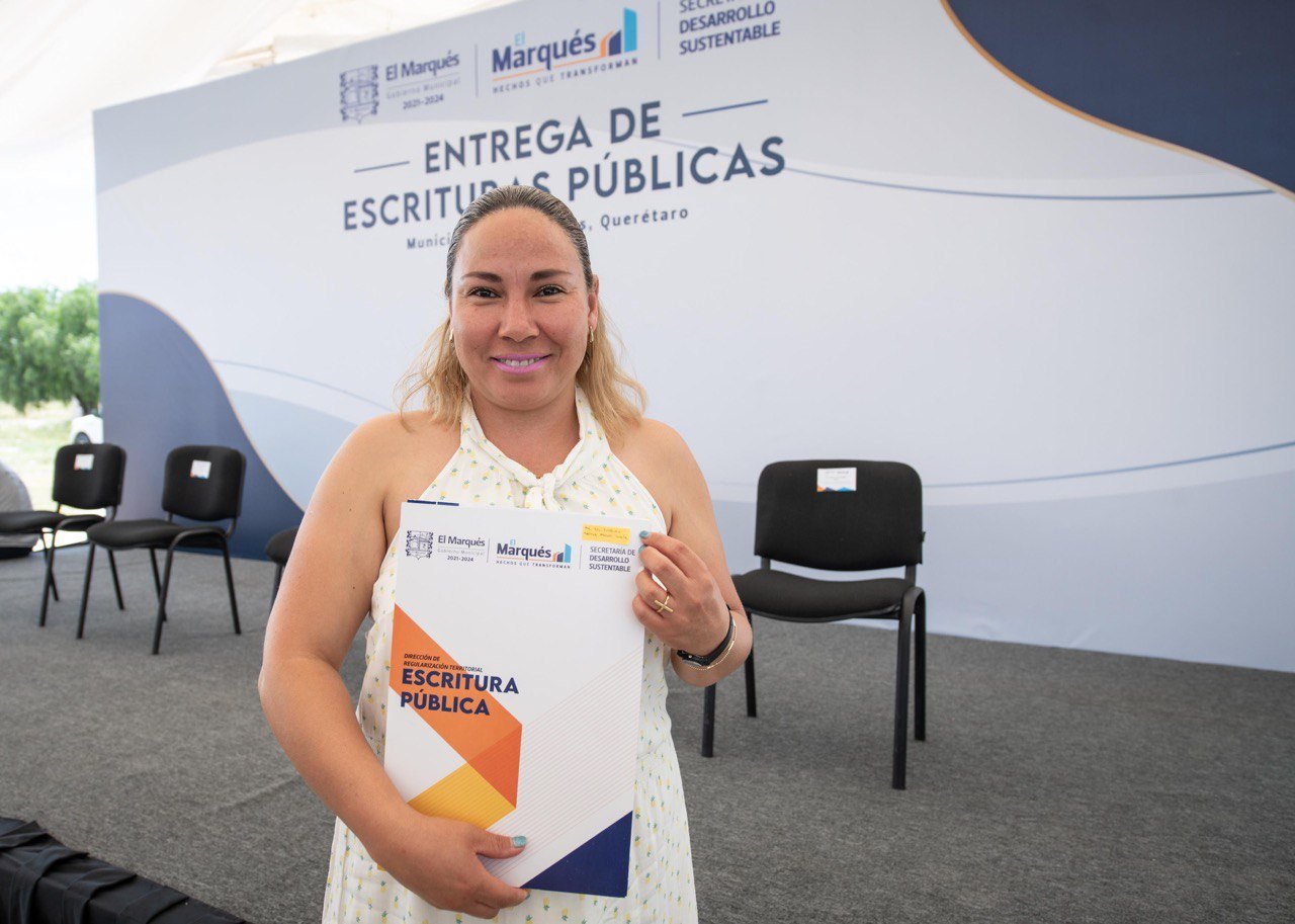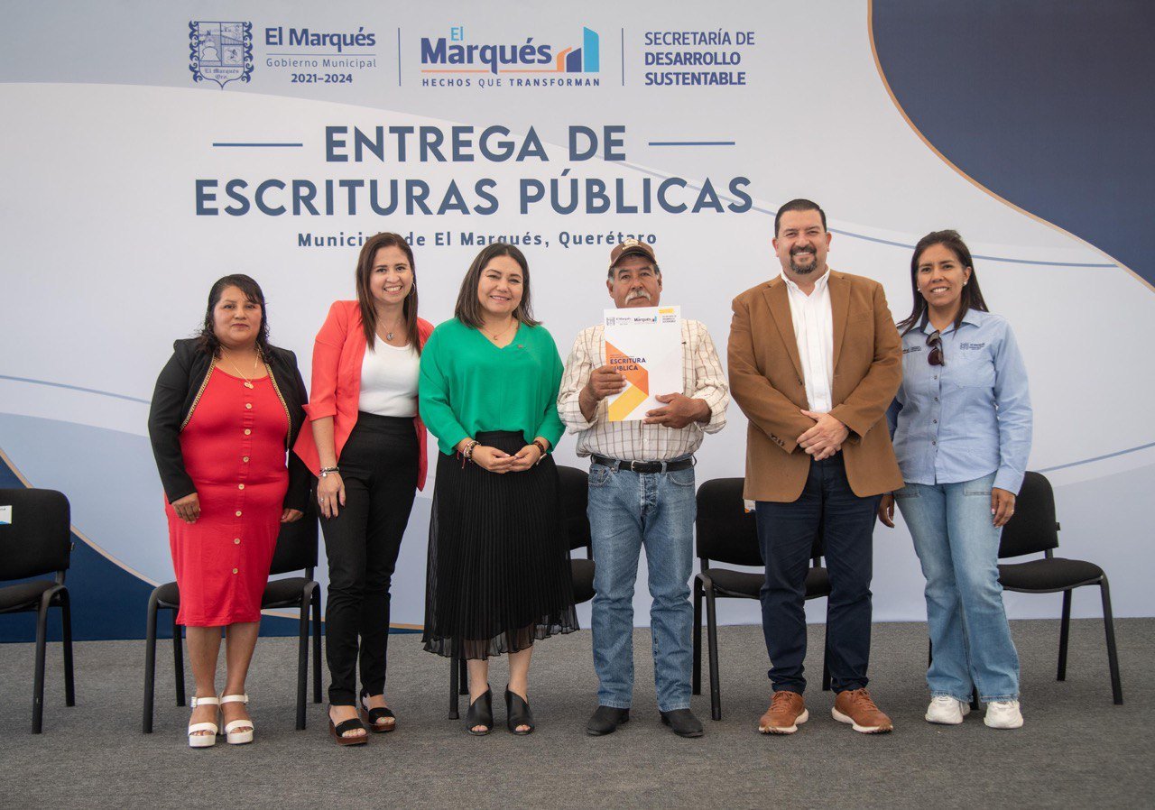 Para dar cumplimiento a los compromisos establecidos en el Plan Municipal de Desarrollo de El Marqués 2021-2024, la presidenta municipal de El Marqués, Claudia Martínez Guevara encabezó la entrega de escrituras públicas a habitantes de la comunidad de Dolores.
