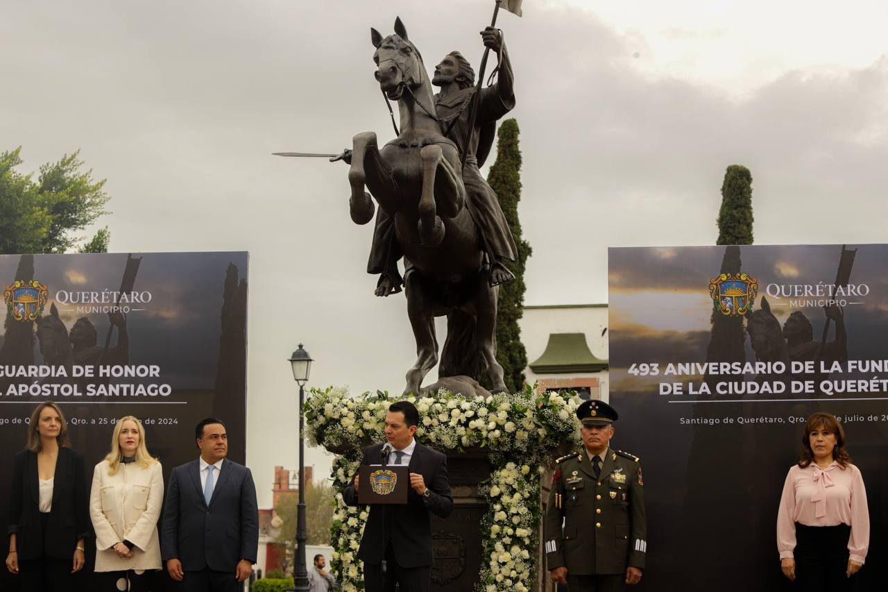 En el tradicional evento que conmemora la leyenda sobre la fundación de nuestra ciudad, esta mañana el Presidente Municipal de Querétaro, Luis Nava, acompañado de su esposa y Presidenta del Patronato del Sistema Municipal DIF, Arahí Domínguez, encabezó la Guardia en Honor a Santiago Apóstol en el monumento ubicado en el anteriormente conocido como cerro del Sangremal en el Barrio de La Cruz; esto en el marco del 493 Aniversario de la Fundación de la Ciudad de Santiago de Querétaro.
